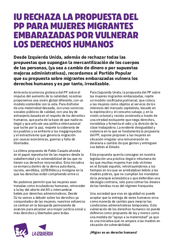 Para Izquierda Unida, la propuesta del PP sobre las mujeres migrantes embarazadas, repite un modelo cosificador patriarcal, que coloca a las mujeres como objetos al servicio de los intereses del mercado capitalista, basado en la explotación y el consumo salvaje, y en la visión colonial y racista construida a través de una otredad excluyente que niega derechos, invisibiliza y fomenta el odio y la división de la clase trabajadora. La evidente desigualdad y violencia en la que se fundamenta la propuesta del PP, supone proponer a las mujeres en situación irregular una remuneración no dineraria a cambio de que gesten y entreguen sus bebés al Estado.