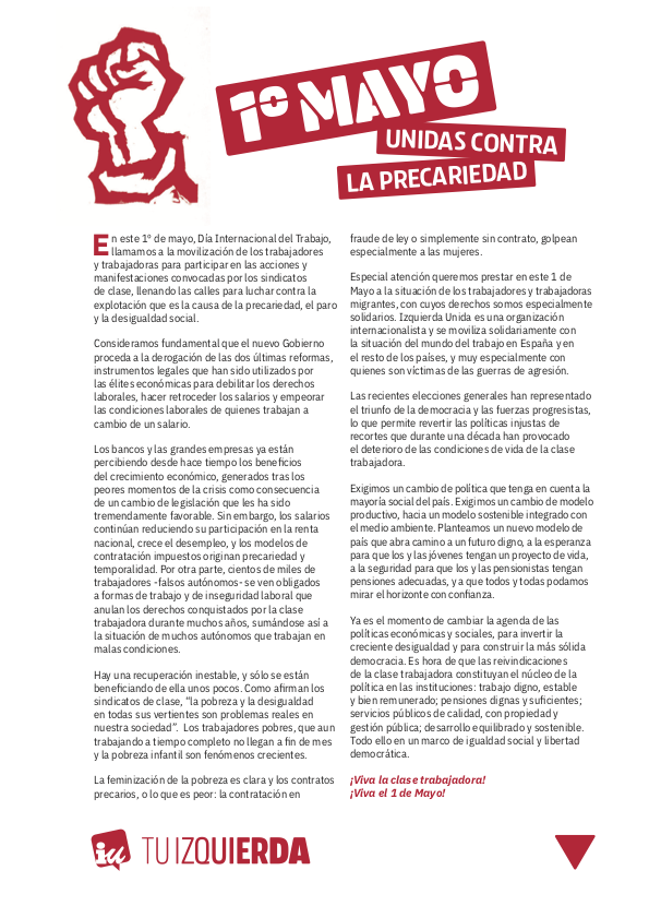 En este 1º de mayo, Día Internacional del Trabajo, llamamos a la movilización de los trabajadores y trabajadoras para participar en las acciones y manifestaciones convocadas por los sindicatos de clase, llenando las calles para luchar contra la explotación que es la causa de la precariedad, el paro y la desigualdad social.