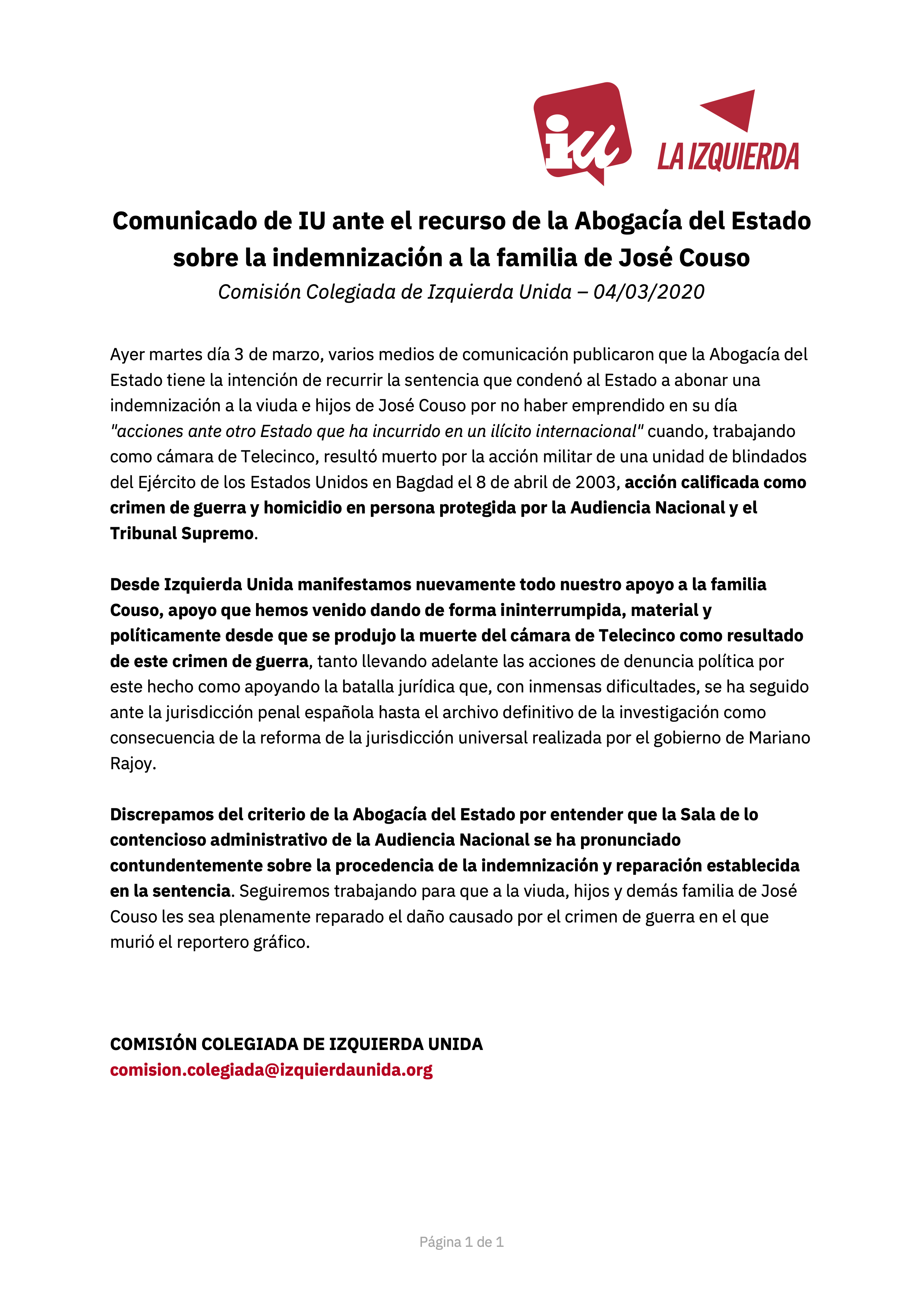 “Desde Izquierda Unida -añade el texto de la Comisión Colegiada- manifestamos nuevamente todo nuestro apoyo a la familia Couso, apoyo que hemos dado de forma ininterrumpida, material y políticamente, desde que se produjo la muerte del cámara de Telecinco como resultado de este crimen de guerra”.