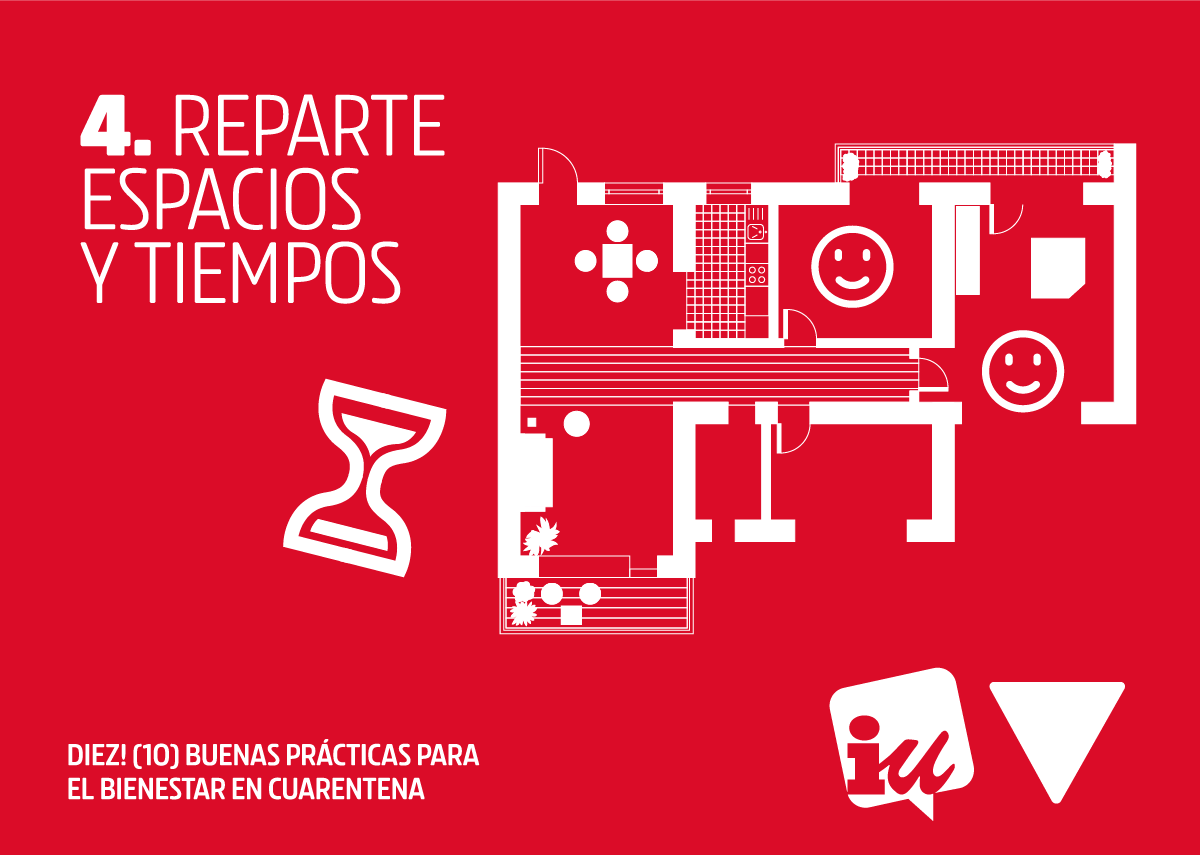 En función del tamaño de la vivienda y del número de personas que cohabitéis, distribuid los espacios y los tiempos, de forma que todas las personas tengan tiempo y espacio para sí mismas. Respetad el uso de las zonas comunes y estableced un orden.