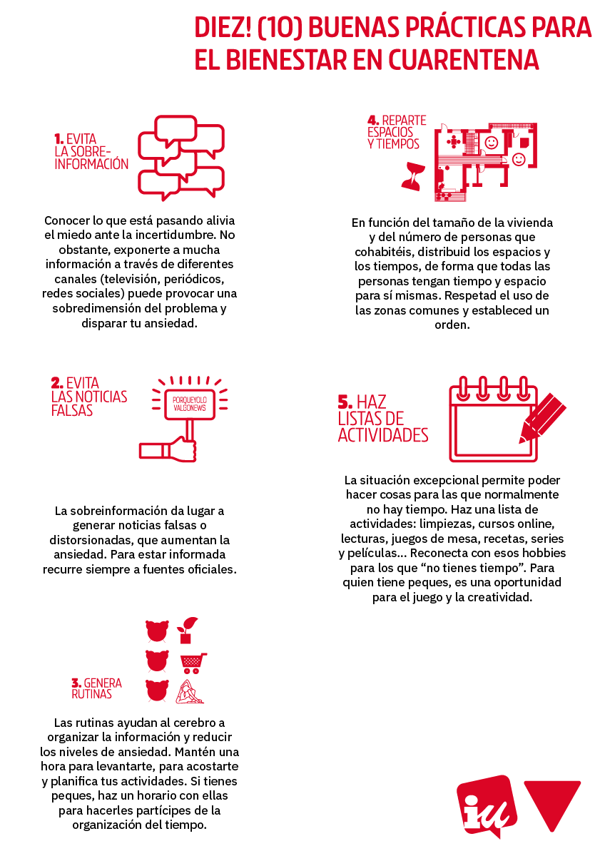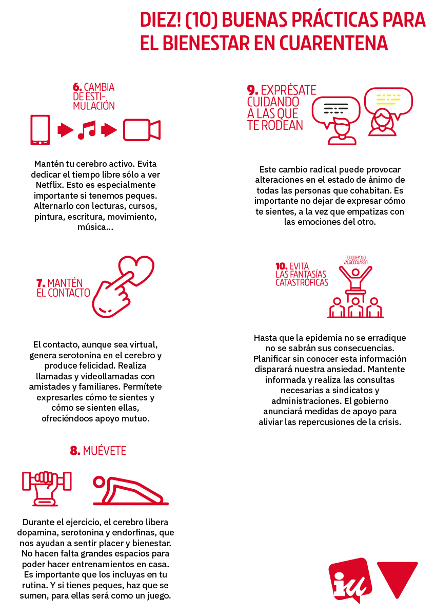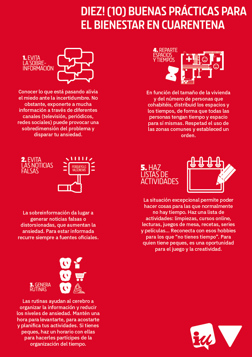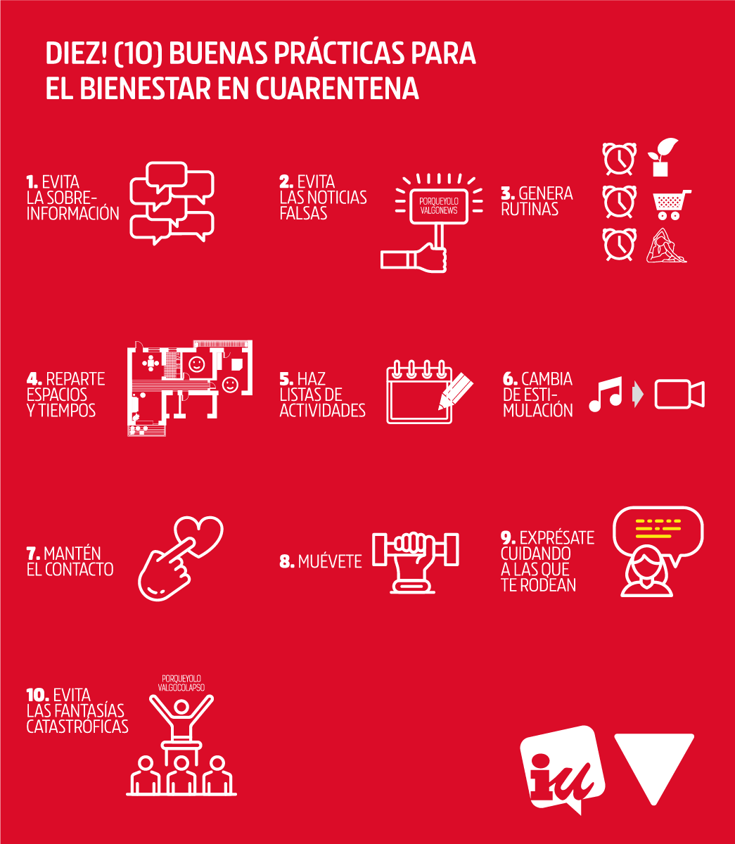 En estos días de confinamiento, es importante cuidar nuestro bienestar emocional tanto como el físico. Por ello, desde Izquierda Unida hemos elaborado un decálogo con consejos que puedes seguir para salir indemnes de nuestra batalla contra el coronavirus no solo física, sino también mentalmente.