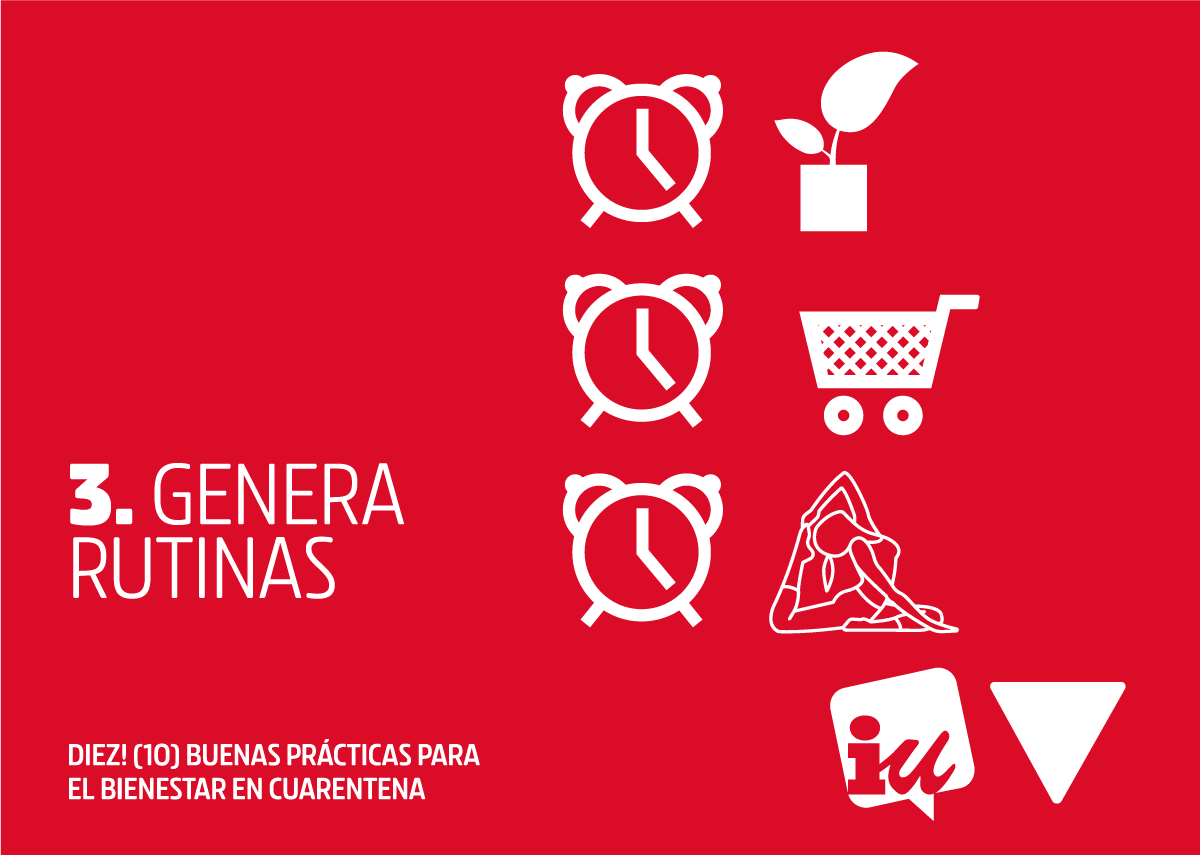 Las rutinas ayudan al cerebro a organizar la información y reducir los niveles de ansiedad. Mantén una hora para levantarte, para acostarte y planifica tus actividades. Si tienes peques, haz un horario con ellas para hacerles partícipes de la organización del tiempo.