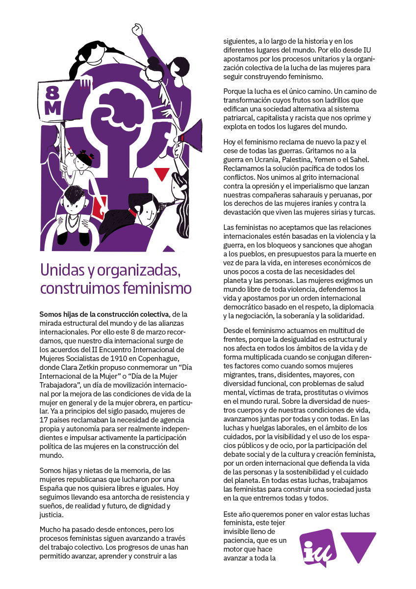 Mucho ha pasado desde entonces, pero los procesos feministas siguen avanzando a través del trabajo colectivo. Los progresos de unas han permitido avanzar, aprender y construir a las siguientes, a lo largo de la historia y en los diferentes lugares del mundo. Por ello desde IU apostamos por los procesos unitarios y la organización colectiva de la lucha de las mujeres para seguir construyendo feminismo.