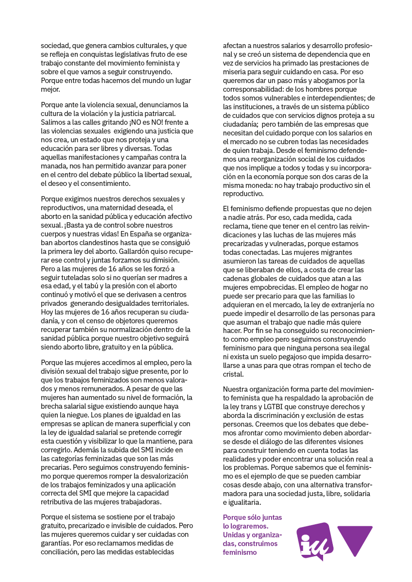 Desde el feminismo actuamos en multitud de frentes, porque la desigualdad es estructural y nos afecta en todos los ámbitos de la vida y de forma multiplicada cuando se conjugan diferentes factores como cuando somos mujeres migrantes, trans, disidentes, mayores, con diversidad funcional, con problemas de salud mental, víctimas de trata, prostitutas o vivimos en el mundo rural. Sobre la diversidad de nuestros cuerpos y de nuestras condiciones de vida, avanzamos juntas por todas y con todas. En las luchas y huelgas laborales, en el ámbito de los cuidados, por la visibilidad y el uso de los espacios públicos y de ocio, por la participación del debate social y de la cultura y creación feminista, por un orden internacional que defienda la vida de las personas y la sostenibilidad y el cuidado del planeta. En todas estas luchas, trabajamos las feministas para construir una sociedad justa en la que entremos todas y todos.