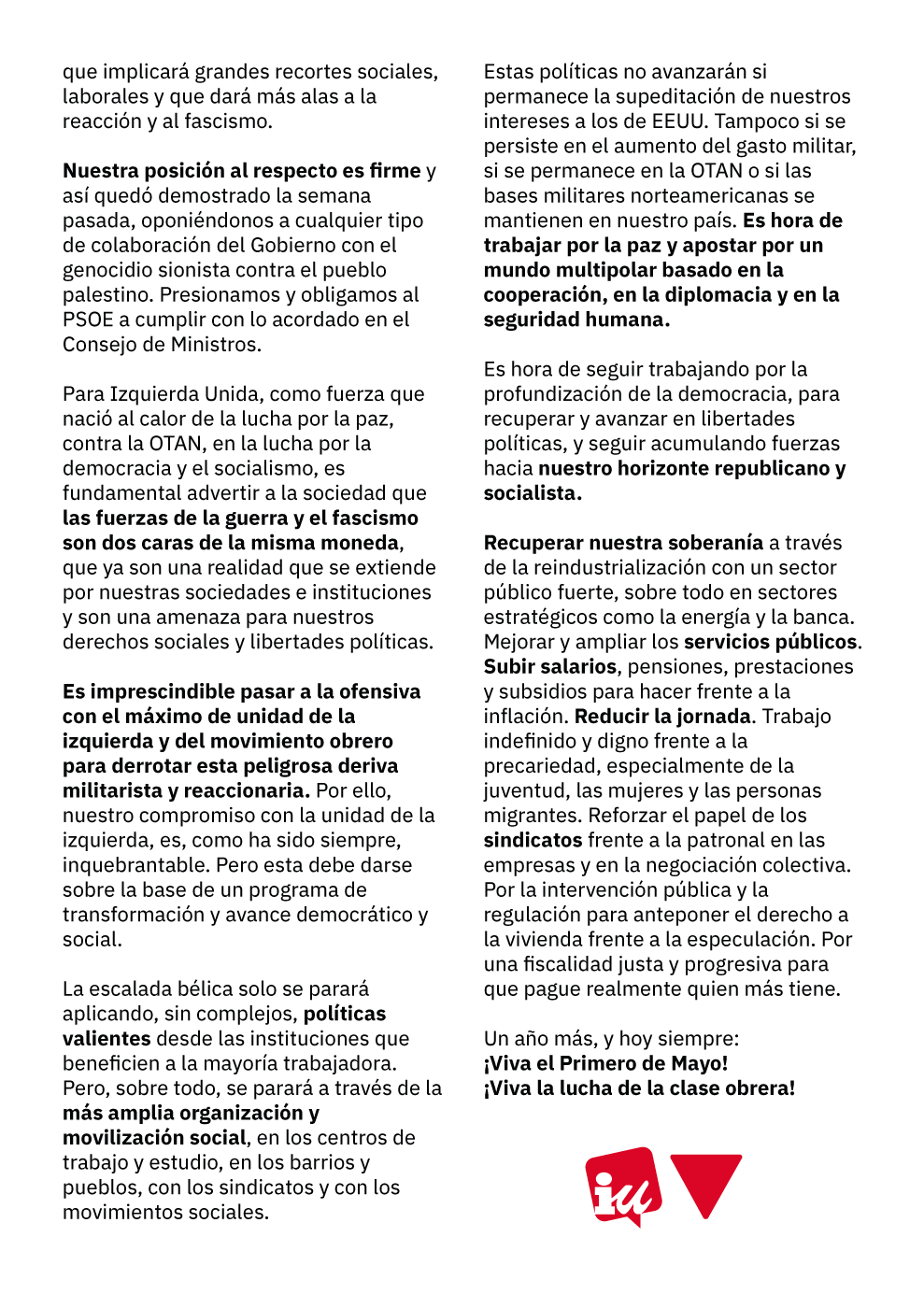 Para Izquierda Unida, como fuerza que nació al calor de la lucha por la paz, contra la OTAN, en la lucha por la democracia y el socialismo, es fundamental advertir a la sociedad que las fuerzas de la guerra y el fascismo son dos caras de la misma moneda, que ya son una realidad que se extiende por nuestras sociedades e instituciones y son una amenaza para nuestros derechos sociales y libertades políticas.