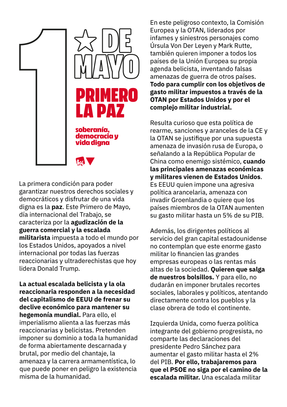 La primera condición para poder garantizar nuestros derechos sociales y democráticos y disfrutar de una vida digna es la paz. Este Primero de Mayo, día internacional del Trabajo, se caracteriza por la agudización de la guerra comercial y la escalada militarista impuesta a todo el mundo por los Estados Unidos, apoyados a nivel internacional por todas las fuerzas reaccionarias y ultraderechistas que hoy lidera Donald Trump.