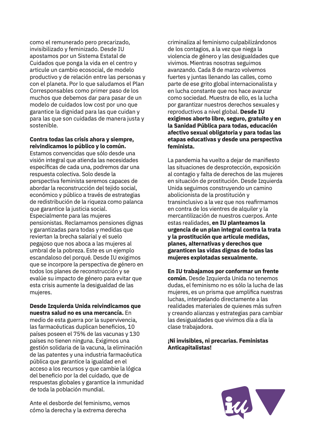 ¡Ni invisibles, ni precarias. Feministas Anticapitalistas! – Manifiesto de la Red Feminista de IU por el 8M de 2021